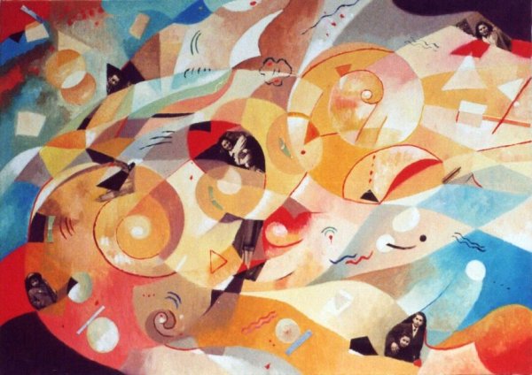 It ‘a painting of the same period of The red boat. Made of oil, with collage of personal photos. In particular, a photograph depicting a family in the early forties. It is my friend’s family, who lived in Tuscany during World War II. They were anti-fascist and partisans, including the aunt. Pictured is the family together celebrating a birth. The painting, inspired by Futurist (Balla), the photo, which I reproduced, has been cut and the people in “sail” in a vortex by a circular motion with light and shadows, … not so much a metaphor of a dispersion of people, because their idea of family in time of war is undermined. The vortex includes them in a single climate … then it will find then joined in the same reconstruction project. At the center of painting there is the young mother with her baby in her arms … hope of rebirth and life, despite everything.
