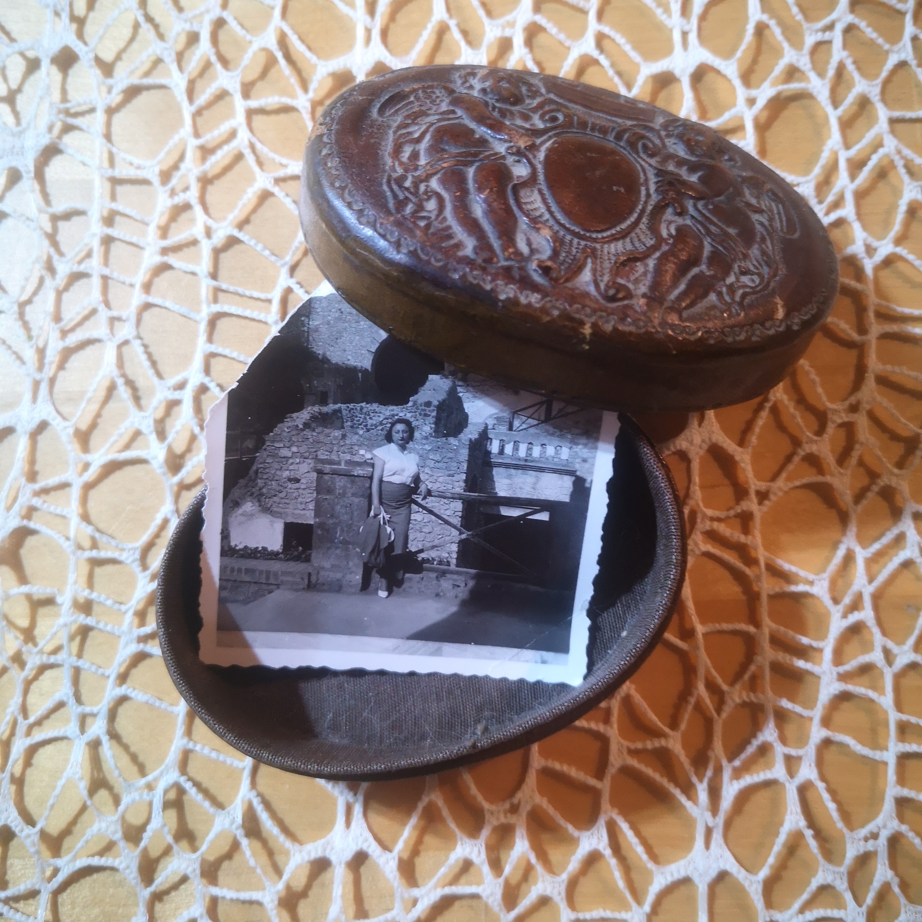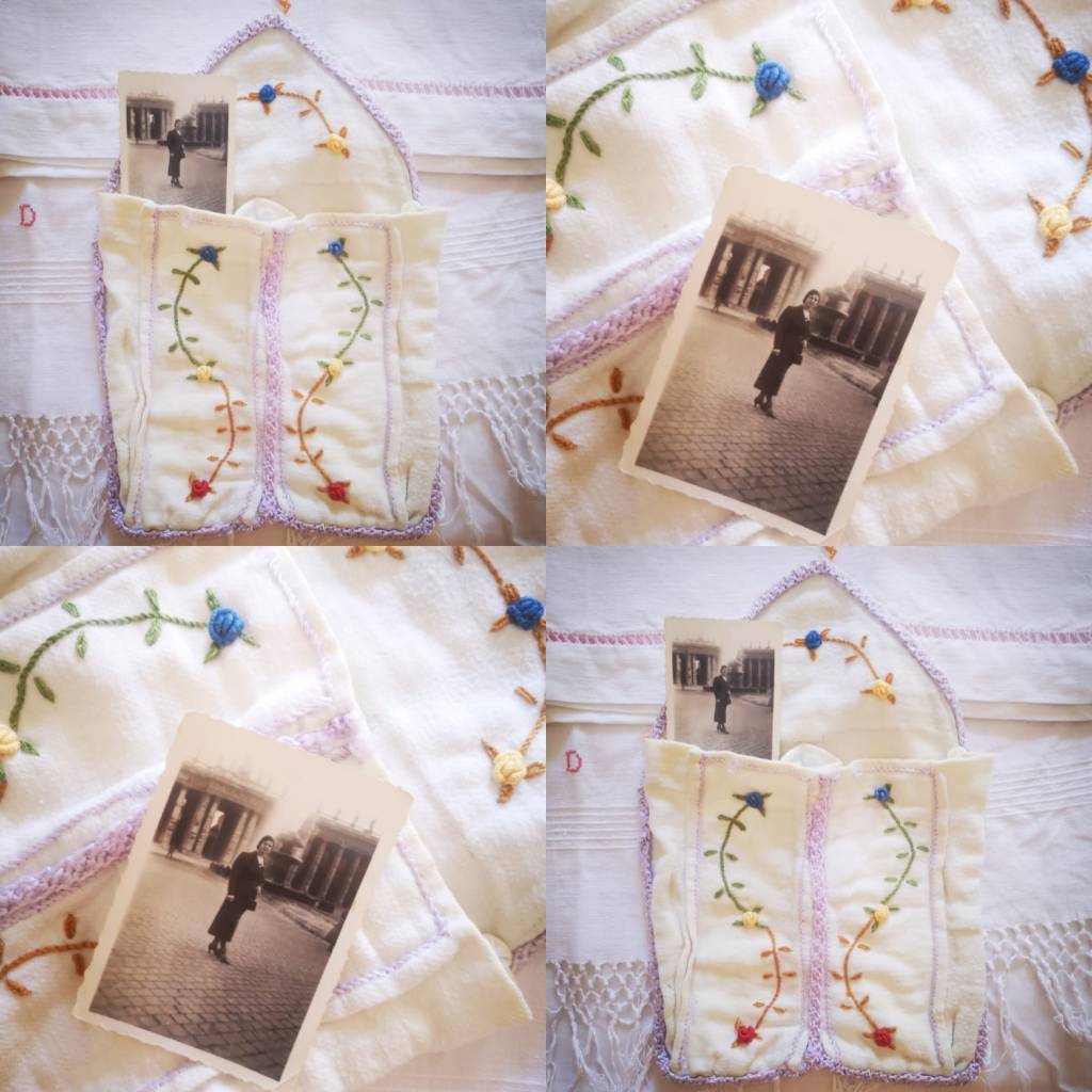 Ricamare con l’aroma del caffè, senza tempo… [acquistata a piazza Dante, adottata nel 2022, a Napoli]Ciò che resta … l’immaginifico delle rovine [acquistata a Porta Portese, nel 2022, adottata con la scatolina]