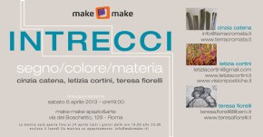 inTREcci SEGNO COLORE MATERIA Cinzia Catena Letizia Cortini Teresa Fiorelli E’ dedicata alla creatività femminile la mostra che si inaugurerà il 6 aprile 2013 alle ore 19, nel noto spazio MakeMake nel rione Monti a Roma. Percorsi artistici… Continua a leggere